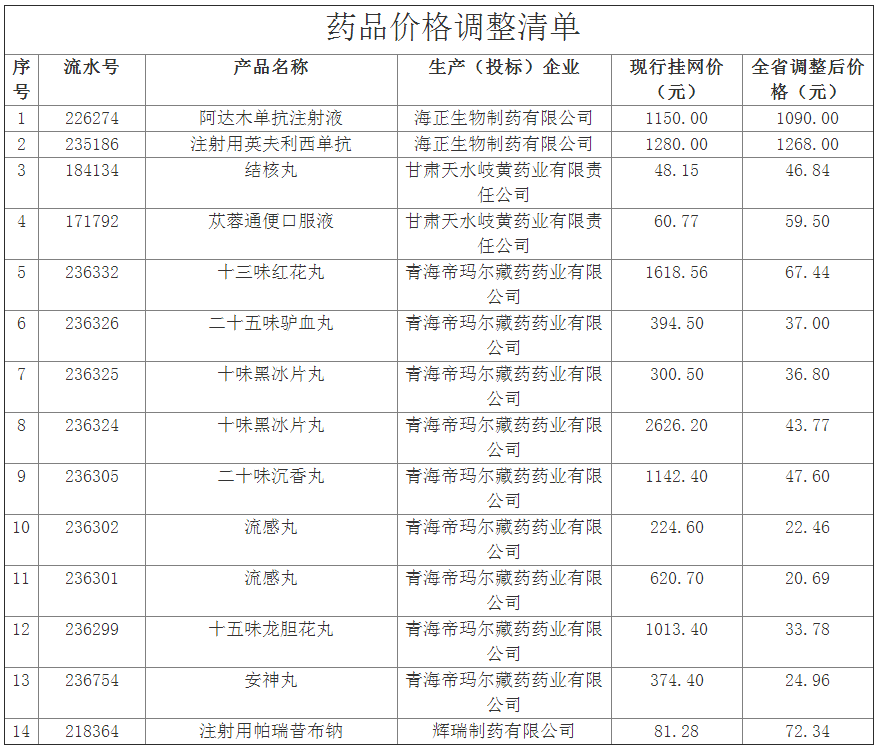 值得注意的是,青海帝玛尔藏药药业包含流感丸在内的的9个藏药则出现了较大降幅,有的从几千元降价到几十元,其中,十味黑冰片丸从2626.2降到43.77元,降幅高达98.33%,其次是十五味龙胆花丸从1013.4元降至33.78元,降幅达96.67%,还有流感丸降幅也超过96%。
