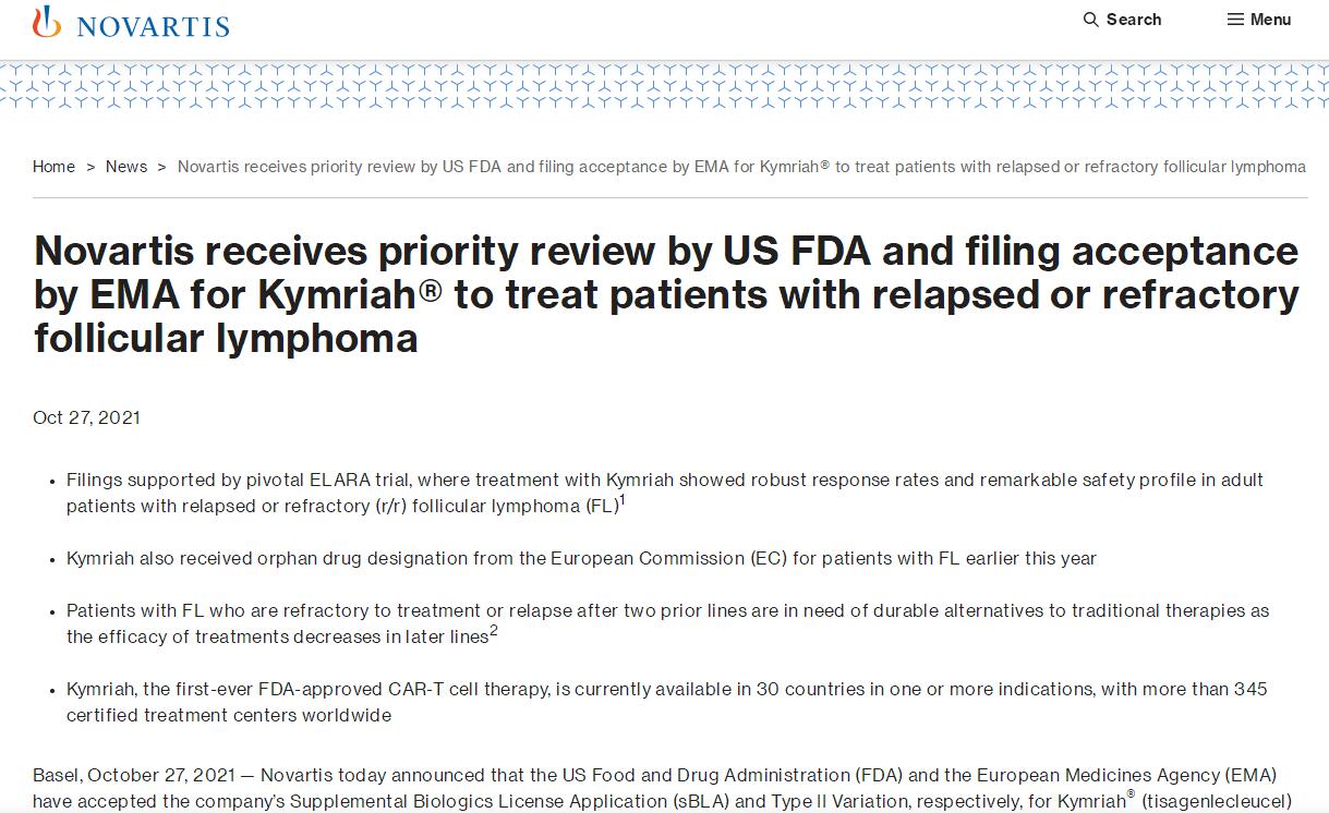值得注意的是,如果获得批准,这将是FDA 授予诺华CAR-T细胞治疗药物Kymriah的第三个适应症。根据FDA官网,授予优先审查的产品FDA将其审查时间缩短到6个月内,这意味着滤泡性淋巴瘤,Kymriah这一新适应症有望于2022年4月获准。