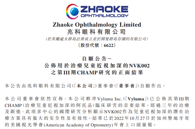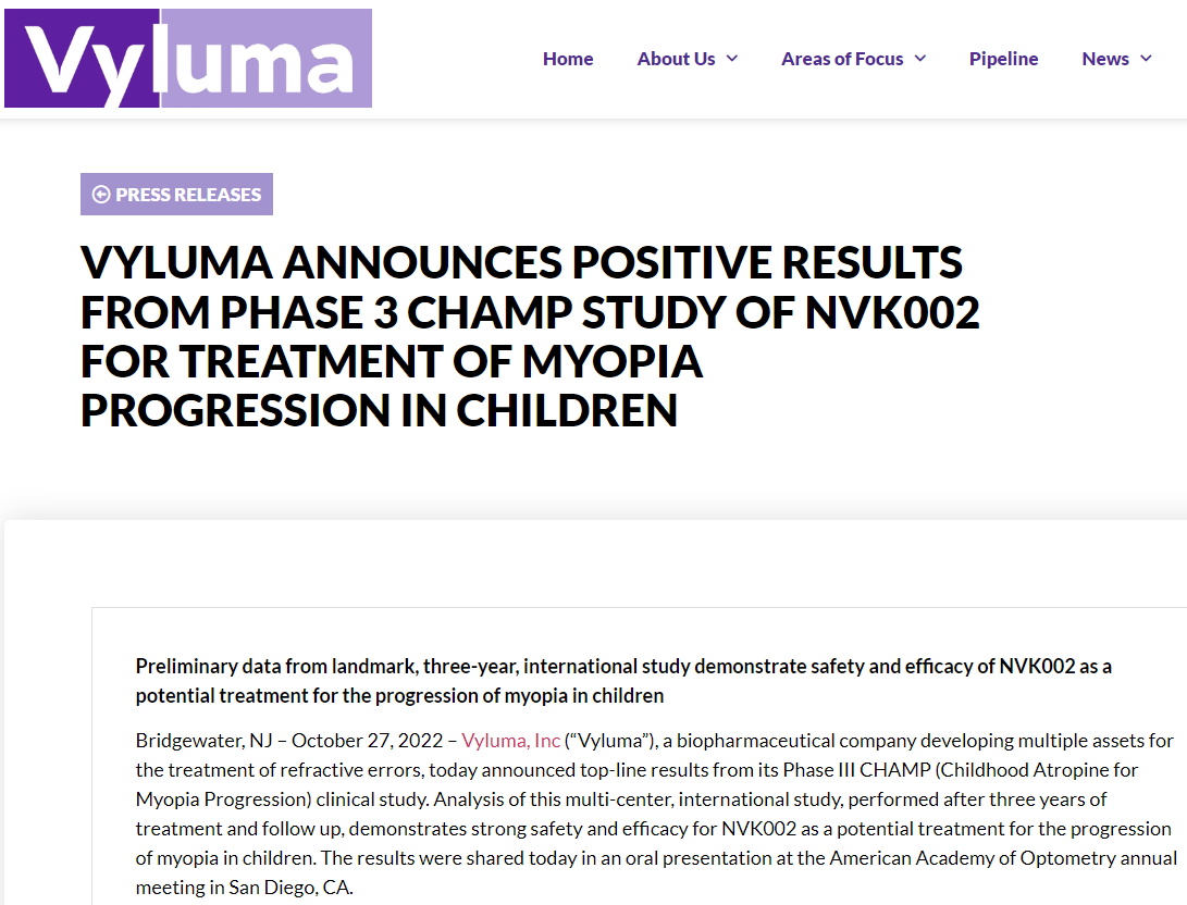 当地时间10月27日,Vyluma公司公布了其在研眼药水NVK002第III期CHAMP(治疗儿童近视加深的阿托品)临床研究的首要结果。经过3年的治疗及跟进,此项多中心的国际研究分析显示NVK002作为儿童近视加深的潜在治疗方案具有强大的安全性及有效性。Vyluma预计在2023年第1季度向美国FDA递交新药申请,而该疗法也有潜力成为首个经FDA批准治疗儿童近视进展的药物。