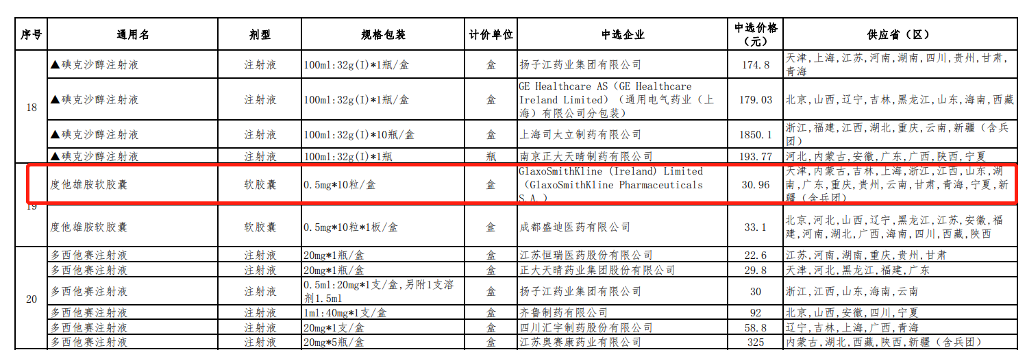 数据显示,在第五批国采中,度他雄胺共有两家企业中标,其中葛兰素史克中标规格为0.5mg*10粒/盒,中标价格为30.96元,较7.483元/粒的最高有效申报价降价约58%。另一家为成都盛迪医药,中标规格为0.5mg*10粒*1板/盒,中标价格为33.1元。此次葛兰素史克被处罚,其他几家国产企业在接下来的采购上或有新机会。