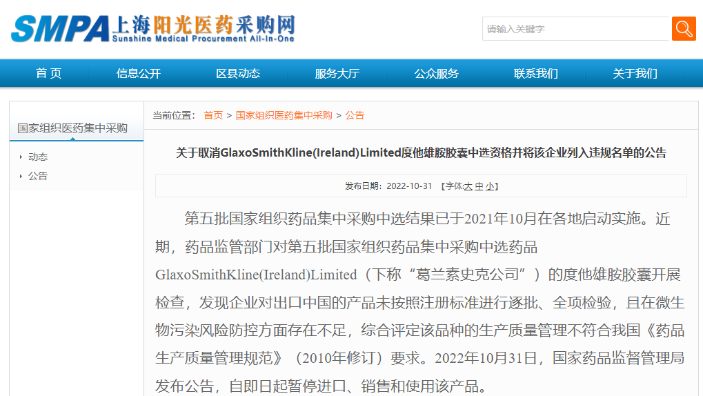 公告称,按照《国务院办公厅关于推动药品集中带量采购工作常态化制度化开展的意见》(国办发〔2021〕2号)精神,经国家组织药品联合采购办公室相关成员集体审议,该企业违背在申报材料中作出的承诺,违反《全国药品集中采购文件(GY-YD2021-2)》有关条款,联合采购办公室决定取消葛兰素史克公司的度他雄胺胶囊中选资格,同时将葛兰素史克公司列入“违规名单”,暂停该企业自2022年10月31日至2024年4月29日参与国家组织药品集中采购活动的申报资格。