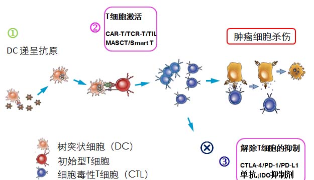 1.通过卡控点抑制剂保护内源性的肿瘤特异性T细胞:CTLA-4单抗, PD-1单抗,PD-L1单抗, IDO抑制剂等。