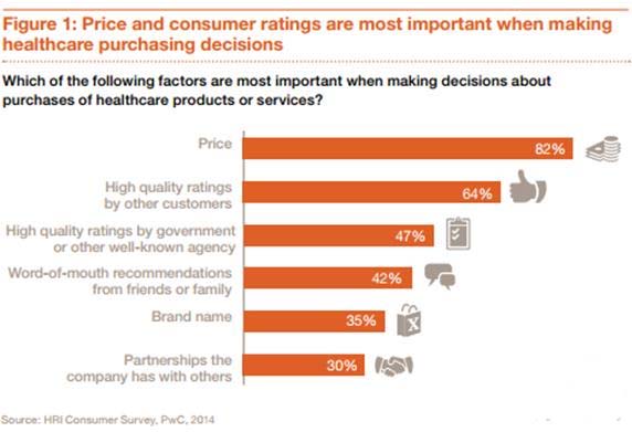 图1:购买医疗健康服务时,医疗服务的价格和消费者评级最为重要,其中价格是最主要的影响因素之一,支持率占82%。64%的受访者选择参考来自其他消费者的高质量评价,47%的受访者选择参考来自政府或其他知名机构的高质量评价,42%的受访者选择参考来自朋友或亲戚口口相传的推荐,35%的受访者选择参考品牌影响力,还有30%的受访者参考公司与其他方的合作关系。