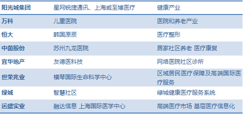 开发商介入医院和养老产业有其一定的优势。首先,这些项目前期投入大,而他们资金实力相对雄厚;其次,由于房产开发导致人口迁入,随之而来的相关医疗与养老配套,需要配合政府部门的顶层设计,并参与部分实施,因此他们也可以更好地把握本地医疗养老需求和发展方向;最后,医疗地产可以和宜居、养老、休闲和养生等产品良好结合,提升原有房产的附加值。所以大批开发商都进入医疗领域,下面仅能列表部分有代表性的项目,实为冰山一角。