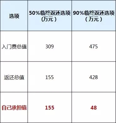 大家可看到表格里面展示的,因选择不同的返还比例,前期支付的入门费也会有差异,基本遵循着高入门费高返还,低入门费低返还的规律。