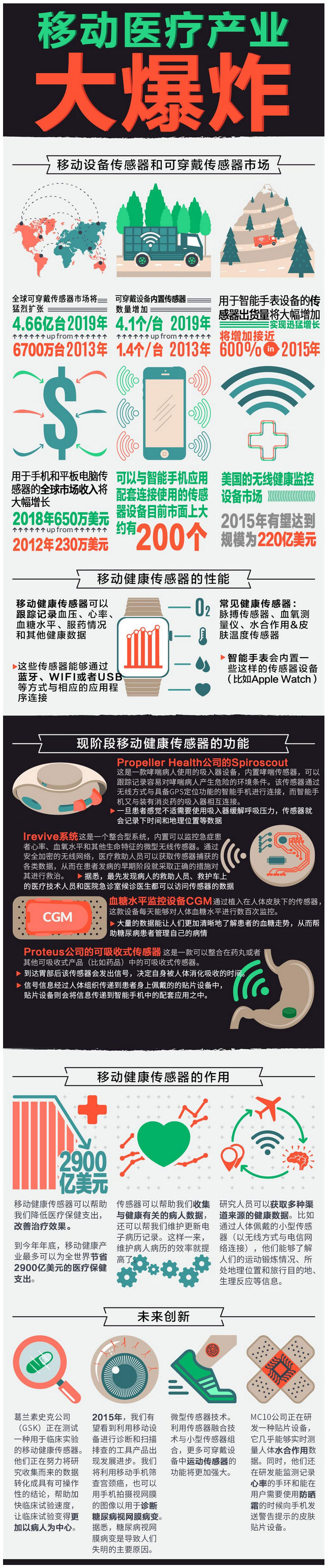 美国无线健康监控设备市场有望在今年达到220亿美元的规模。全世界移动设备传感器市场的收入也会出现增长。2012年,移动设备传感器全球市场的收入为23亿美元。2018年,这一数据将增长到65亿美元。