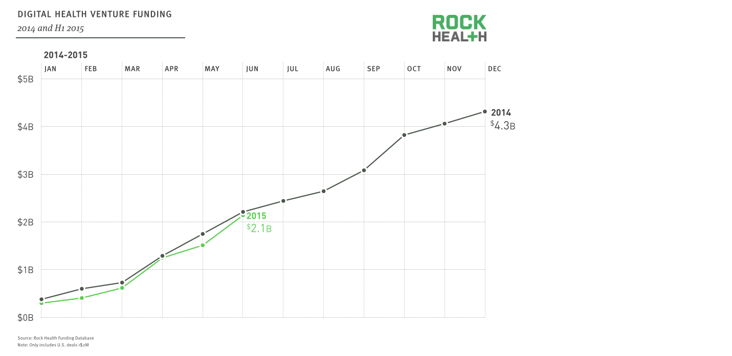 美国数字医疗孵化器RockHealth日前发布了2015年上半年美国数字健康市场投融资报告。到目前为止,美国数字健康市场共发生了136笔规模在200万美元以上的投资交易,交易总金额达到了21亿美元。与其他相关数据相比,RockHealth追踪的数字健康公司数量相对较少,追踪的交易规模也均在200万美元以上。