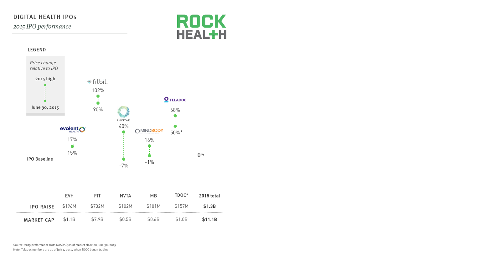 此外,上半年数字健康市场共有5家企业进行了IPO(首次公开招股),分别是Evolent Health、Invitae、Fitbit、Mindbody和Teladoc,总融资规模达到13亿美元。据预计,未来可能进行IPO的企业包括Jawbone、Practice Fusion、Health Catalyst和Proteus Digital Health等。