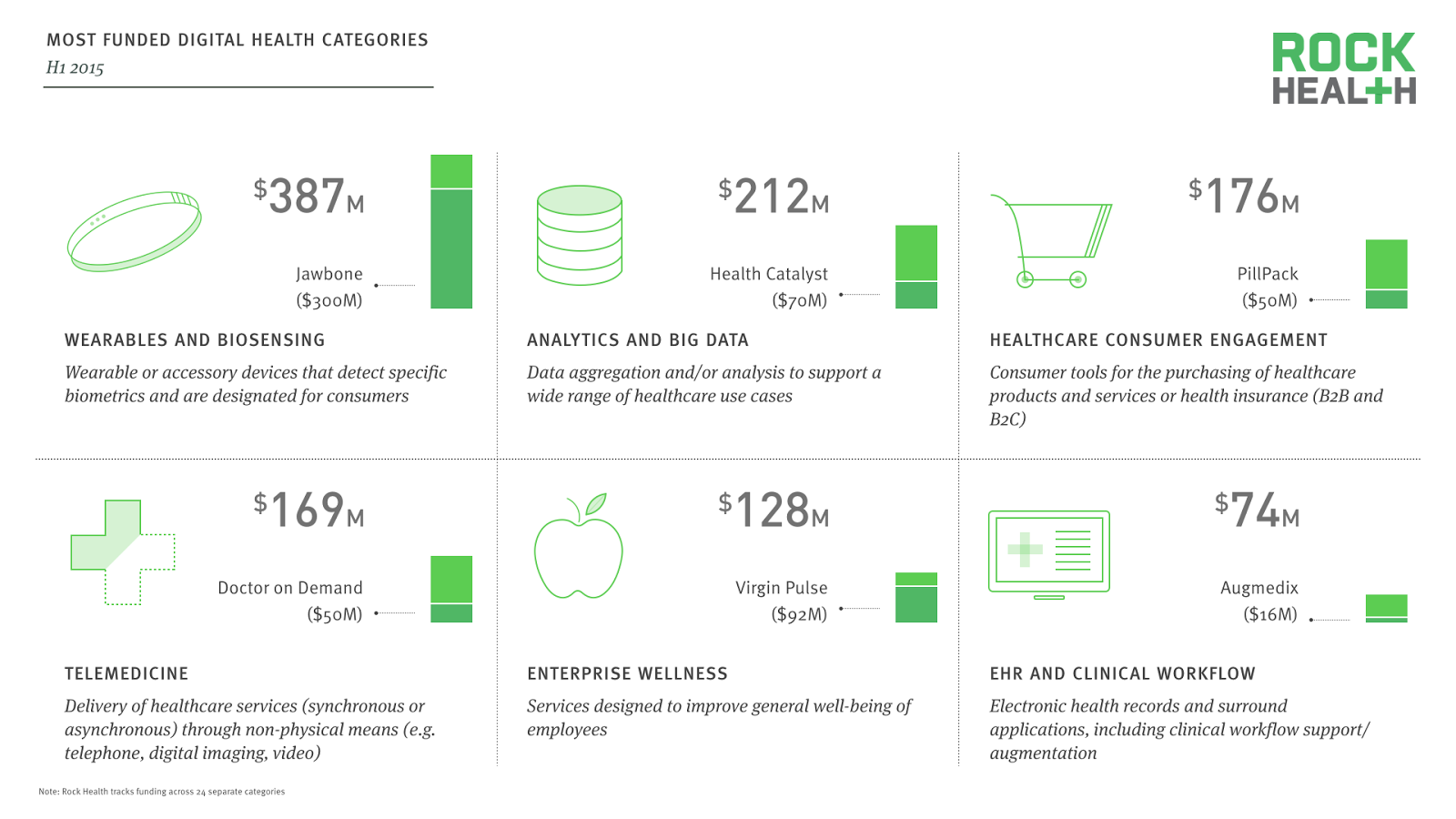 按细分类别划分,可穿戴和生物传感器市场的融资额最高,达到了3.87亿美元(Jawbone一家独占3亿美元)。分析和大数据排名第二,融资额为2.12亿美元。医疗保健消费者互动方面的融资额为1.76亿美元,远程医疗为1.69亿美元,企业健康为1.28亿美元,EHR和临床工作流为7400万美元。