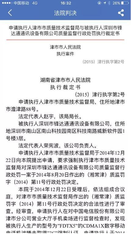 但是记者查询资料发现,就在2015年锋达通还收到了湖南省津市市人民法院执行裁定书:湖南省津市市质量技术监督局在对中国电信股份有限公司津市分公司营业大厅手机卖场进行监督检查时,发现锋达通生产的型号为“FDTX5”的CDMA1X数字移动电话机涉嫌未取得“3C”强制认证。