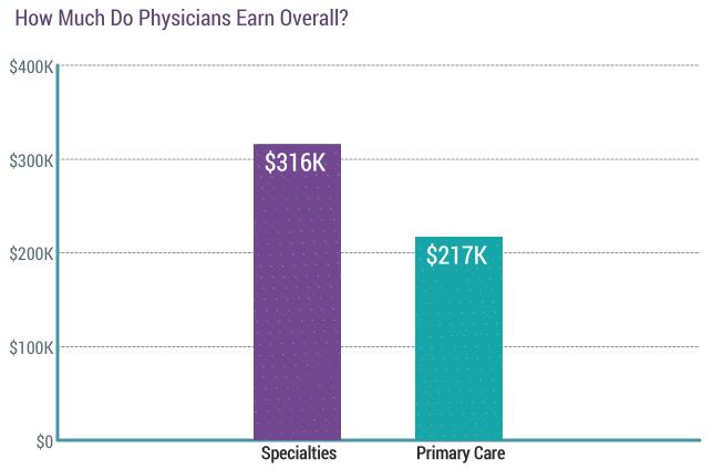 根据今年参与调查的医生们的反馈,他们的平均全职年收入为29.4万美元。对于被聘用的受访者而言,他们的总收入包括工资、奖金津贴和分红。而对于合作或者独立经营诊所的受访者而言,总收入包含税后营收和税前可扣除营业支出。今年统计出的结果显示,专科医师比他们的初级护理医师(PCP)同行平均年收入要高出约46%(分别为31.6万美元和21.7万美元)。