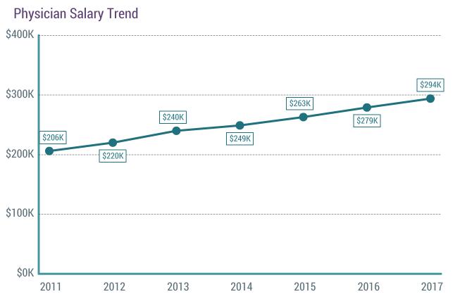 从上图可看出,近七年来全美医生的平均年收入呈稳步增长状态。医生猎头公司Merritt Hawkins的高级副总裁Travis Singleton表示:“受雇医生们工资增长的主要原因是针对医生的争夺日渐激烈。不论是医院和卫生保障体系,还是急诊中心和联邦医疗中心,亦或者直接医疗和上门医疗,他们都需要雇佣医生。”
