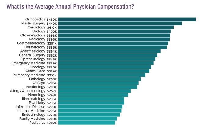 如上图所示,2017年平均年收入最高的三类医生分别为骨科医生(48.9万美元)、整形外科医生(44万美元)和心血管病医生(41万美元)。而在2016年,平均年收最高的依然是骨科医生(44.3万美元),排第二的是心血管病医生(41万美元),而皮肤科医生(38.1万美元)则名列第三。今年收入垫底的则是儿科医生(20.2万美元)、家庭医生(20.9万美元)和内分泌医生(22万美元)。儿科医生和家庭医生在去年也是不幸垫底。
