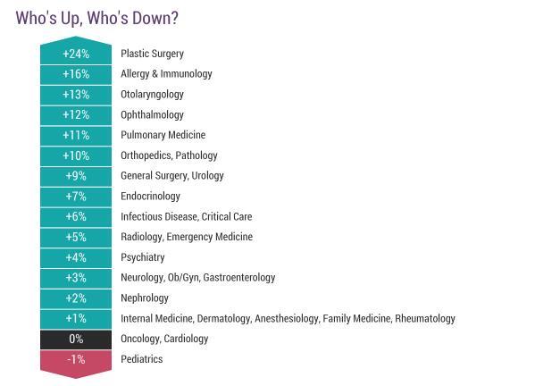 与去年相比,儿科医生、心血管医生和肿瘤医生的收入几乎没有变化,对比其他科室的受访医生,他们的收入都有着不同程度的涨幅,其中涨幅最大的是整形外科医生和过敏症专科医生,分别上涨了24%和16%。