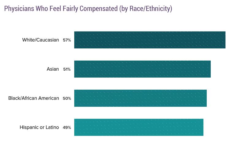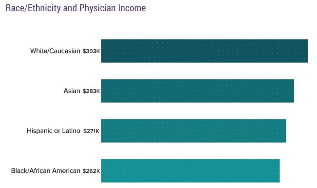 本年度是Medscape第一次在调研中加入了受访者的种族因素。在受访者中超过3%的人是白种人或者亚裔,他们的平均年收较高,分别为30.3万美元和28.3万美元。收入靠后的是拉美裔和非洲裔美国人,分别为27.1万美元和26.2万美元。