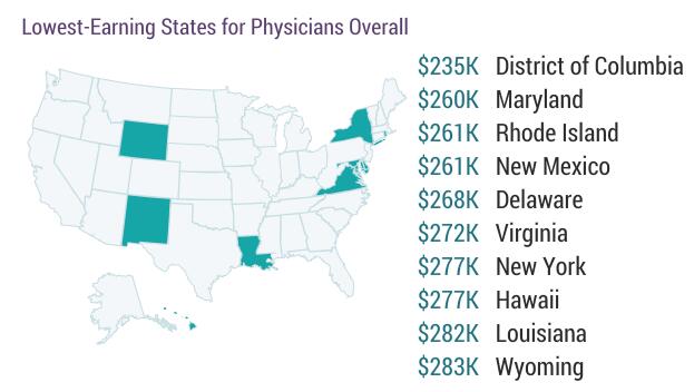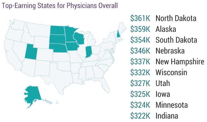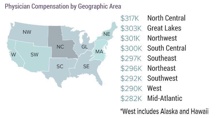 据受访医生们反馈的情况,今年全美医生收入最高的地区为中北部地区(31.7万美元)和大湖区(30.3万美元),而平均收入最低的地区则分别是西部地区(包含阿拉斯加和夏威夷,28.2万美元)和中大西洋地区(29万美元)。