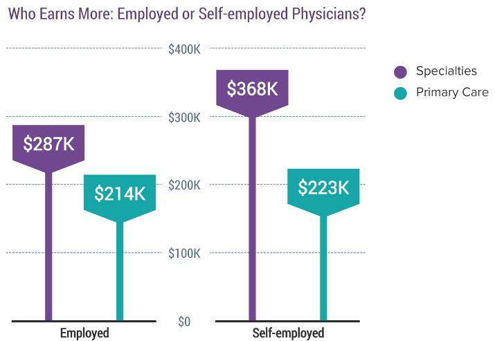 从图表中可以轻松得到结论,受雇医生挣得比自主经营医生更少,同时自主诊所经营者们在拿着更高收入的同时面临的行政和商业问题更少。但是仍要注意的是,自主经营的初级护理医师(PCP)也仅比受雇同行的收入高出约4%(分别为22.3万美元和21.4万美元)。然而自主经营的专科医师的收入则比他们受雇同行高出28%(分别为36.8万美元和28.7万美元)。