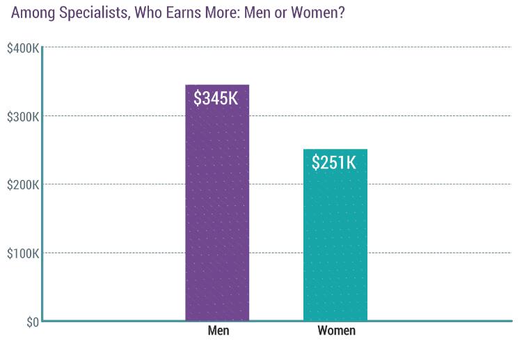 今年美国专科医师的男女年平均收入差距为37%,分别为34.5万美元和25.1万美元,收入差距比起去年增长了4%。2016年男女专科医师的平均收入分别为32.4万美元和24.2万美元。这个结果可能是由于高收入科室的受访女性专科医师比例较低导致。