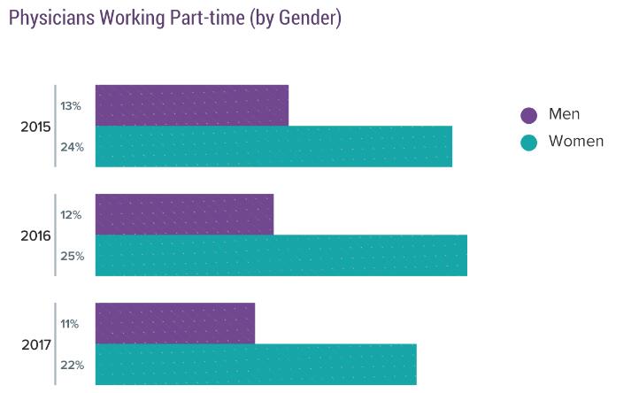 今年的报告中,有11%的男性受访者和22%的女性受访者表示自己是兼职医生(每周行医时间低于40小时)。这个比例不论在哪个性别组都呈现了较小的降幅,去年的男女兼职医生比例分别为12%和25%。