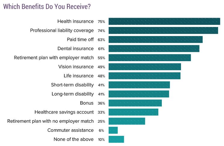今年有四分之三的受访医生表示自己获得了补贴医疗保险,同时有74%的受访者接受了医疗事故保险。另外有超过半数(63%)的医生享受了带薪休假,还有61%的医生享受了雇主补贴保险,55%的人享受了与雇主相同的退休计划。只有10%的医生表示今年未曾享受任何福利。