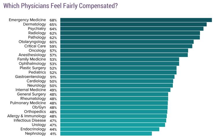 Medscape的调研从2012年开始加入了医生对收入满意度的调查,在当年的报告中,皮肤科医生最倾向于对自己的收入感到合理,到了今年他们也仍然居于榜单第二。今年对收入满意比例最高的是急诊医生。而对收入满意比例最低的三类医生则是肾病医生(41%)、内分泌科医生(44%)和泌尿科医生(47%)。今年受访医生的总体收入满意比例为54%。