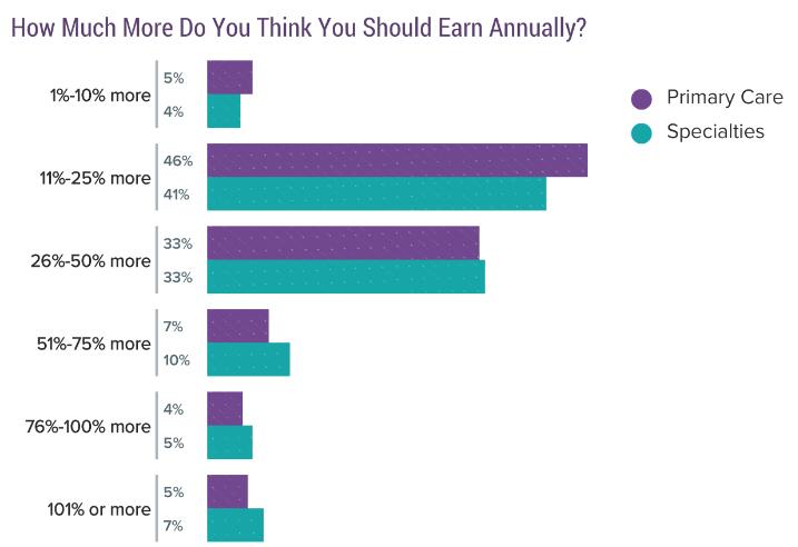从今年开始,Medscape不仅对各类医生的收入满意度进行了调研,还针对那些对自身收入不满意的医生的年收入增长期望值进行了调查。在初级护理医师中,有46%的人表示自己的收入应当增长11%-25%,而专科医生中也有41%的人抱有相同想法。然而两类医生中都有约三分之一的人表示自己的年收入应增长26%-50%。比起专科医师,初级护理医师选择较低期望值的趋势要稍高。