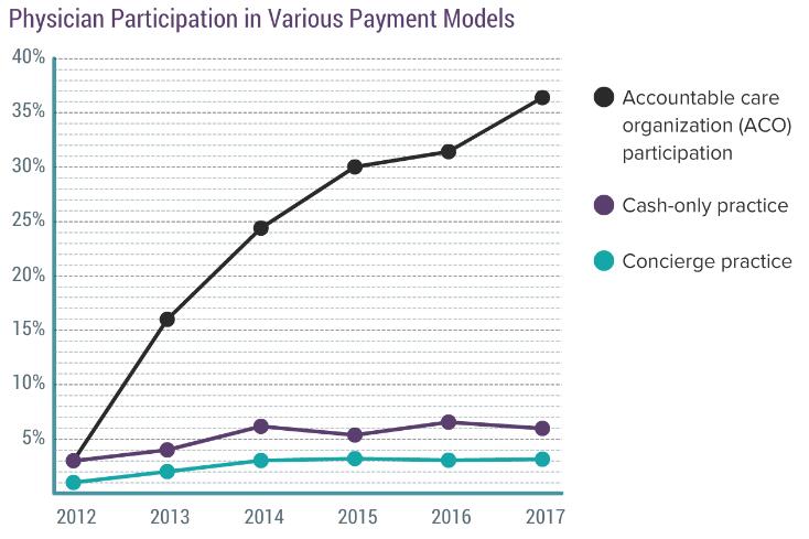 在今年的调研中,参与医疗责任组织(ACO)的医生比例有了大幅度的增长,从2012年的3%增长到了2017年的36%。而在这段时间当中,仅支持现金支付和门房支付的医生比例仅有小幅度的增长,分别从3%增长到6%和1%增长到3%。
