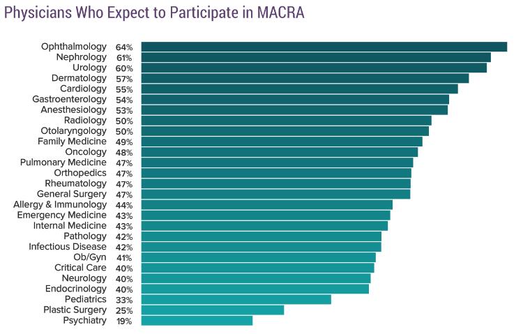 2015年通过的医疗保险访问及CHIP再授权法案(MACRA)在2017年1月1日开始生效。在今年的调研中,关于医生是否愿意参与该法案也作为调查选项,而大多数医生倾向于愿意加入(43%)和还未决定(35%)。其中眼科医生的参与意愿最高,有64%的受访者表示愿意参与,而精神科医生的参与意愿最低,仅为19%。