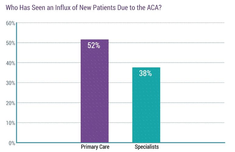 只有略超半数(52%)的初级护理医生(PCP)表示自己发现平价医疗法案带来了新病人的涌现,比起去年的49%,仅有小幅上涨。而专科医生在这方面的涨幅则更明显,从去年的30%上涨到38%。