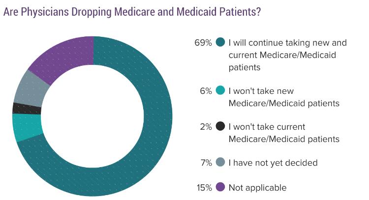 超过三分之二(69%)的受访医生表示他们愿意接受并治疗持现行医保和医疗补助的患者。但是在去年,不论是受雇医生组还是自主经营医生组,他们对此显得比今年更为积极,愿意接受此类患者的比例分别为77%和84%。