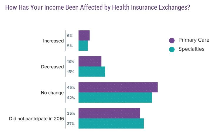 在今年Medscape的调查中,表示自己正在参与医疗保险交换项目的医生比例有了大幅度增长,从2016年度的19%增长到了今年的35%。