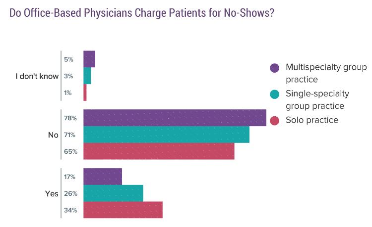 今年的调查结果显示,诊所科室的种类越多,那么医生向错过预约的病人收费的可能性就越低。超过四分之三的多科室诊所受访医生表示自己不会向错过预约的病人收费,相比起来,单门类科室诊所在这一项的人数比例为71%,另外独立经营诊所的医生有65%表示不在这种情况下收费。总体看来,不向缺席预约的病人收费的医生比例为72%。