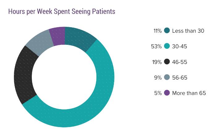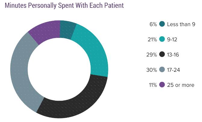对于今年调研中的大多数(59%)的受访医生而言,他们在每个病人身上花费的平均时间为13-24分钟。在上一年度的调查中还加入了性别因素,有11%的男性医生和15%的女性医生表示对每个病患的问诊时间为25分钟或更多。而今年的结果中,不论男女,耗时25分钟及以上的医生均为11%(图表数据不包含精神科医生)。