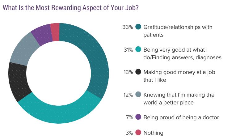 在今年的调研中,有33%的受访医生表示,自己与病患构建的和谐关系以及病人对自己的感激之情,是他们工作中最能使自己感到有所回报的因素。有相似比例(31%)的医生表示,能从事自己擅长的工作是最有回报感的因素。另外,有13%的医生觉得当医生能得到体面的薪资,12%的医生认为自己在使世界变得更美好,以及7%的医生以自己的职业为傲,相比起来这三者的比例显着偏低。极少数(3%)医生表示自己不能从工作中获得回报感。