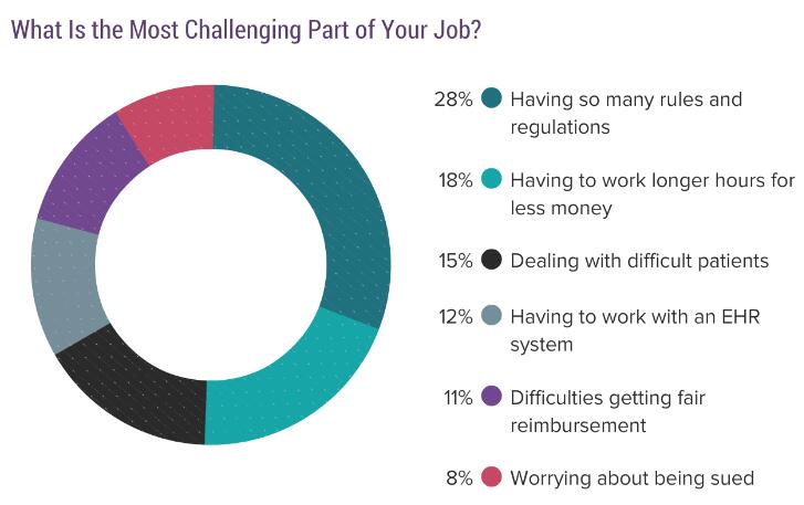 在今年的Medscape年报中,除了考量了医生对于自己工作的回报感,还调查了受访者对于自己哪些工作感到最棘手。超过四分之一(28%)的医生选择了工作中的繁文缛节过多。位列第二的因素是,工作时长与收入不对等(18%),紧随其后的是处理棘手病患(15%)。
