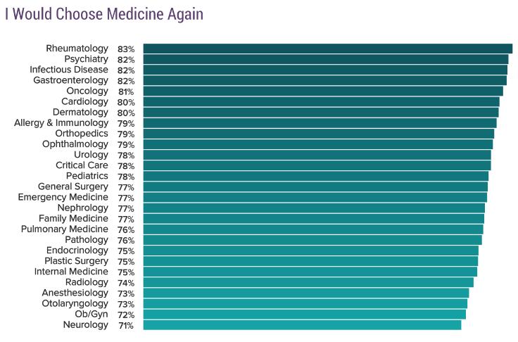 在调查中假定了如果有重头再来的机会,受访医生是否还会再次选择以医生为职业,在肯定回答中位列榜首的是风湿病医生(83%),随后是精神科医生、传染病医生和肠胃科医生,其比例均为82%。总体而言,77%的受访医生表示自己仍旧会选择从医,其中比例最低的是神经科医生(71%)。