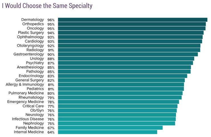 在那些仍愿意选择从医的受访医生中,再次调查了他们若有机会选择,是否还会选择现在执业的专科。其中高达96%的皮肤病医生表示自己仍会选择这个专科,而榜单中垫底的则是内科医生(64%)和家庭医生(67%)。
