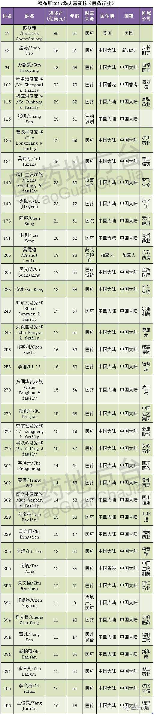 从行业来看,据医药地方台统计,有38位医药人(家族)上榜。其中,进入总榜单前100强的医药人有三位:陈颂雄、赵涛(步长制药)、孙飘扬(恒瑞医药),净资产分别是86、46、43亿美元。