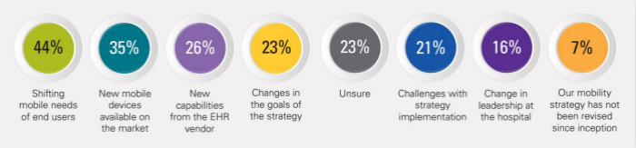 23%的受访者回答不确定,7%的受访者表示其移动化策略没有更新。从受访者选择更新移动化策略的原因来看,绝大多数受访者选择了终端用户的需求变化(44%)以及技术和移动设备的发展变化(35%);其次为EHR供应商的新功能(26%)、跟随总体战略目标的变化进行调整(23%);其他原因包括实施原策略有困难(21%)和医院领导层变化(16%)等。