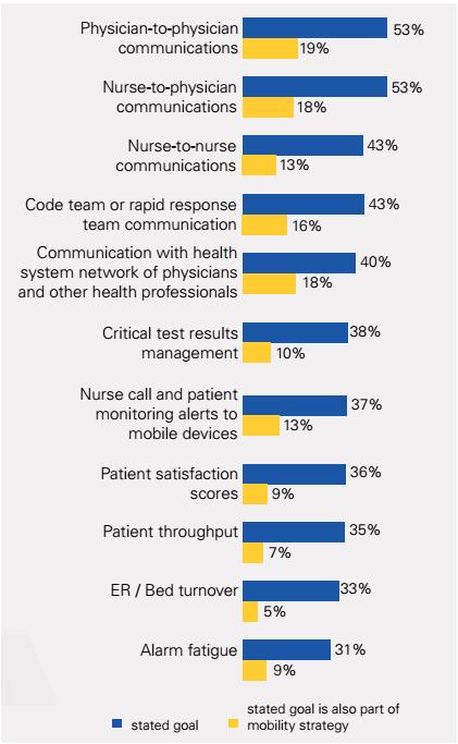 另外还有九个选项,从改善代码团队的沟通到疲劳报警灯都显示出了类似的趋势,在正式移动化策略中纳入了医院目标的在5%到18%之间。这一结果表明,一些负责规划移动化策略的团队已经抓住了机遇,致力于对医院的战略目标进行更有影响力的运作。