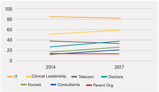 临床领导的参与度从2014年的51%上升到了60%,医生和护士的参与度也分别上升了9%和10%。将临床人员纳入移动化策略规划团队的趋势越来越明显,表明医院正逐渐认识到临床观点在移动化策略制定中的重要性。