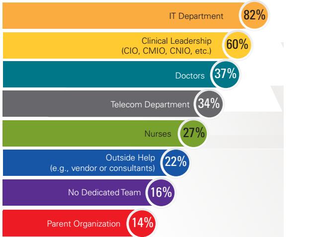 这表明在一些医院中,移动化策略仍被视为一种安全策略,以管理各种已获批准的通过移动设备共享(或不共享)患者信息的方法。调查对象中有19%的人表示,他们的移动化策略由通信团队执行,而仅有9%的人拥有一个监督和执行移动化策略的移动团队。14%的受访者表示移动化策略的执行分摊至各个部门。25%的参与者表示,他们的单位没有任何执行移动化策略的方法。