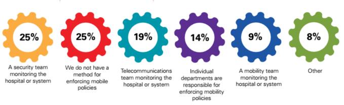 制定政策或规则比确保遵循规则要容易得多。在调查中,我们询问了医院采取了哪些措施来监督其移动化策略的实施情况以及如何执行策略。有25%的受访者表示,其移动化策略由一个监督医院或医疗系统的安全小组执行。