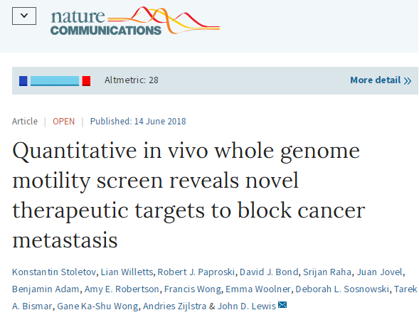 这项研究以“Quantitative in vivo whole genome motility screen reveals novel therapeutic targets to block cancer metastasis”为题发表在《Nature Communications》杂志上。