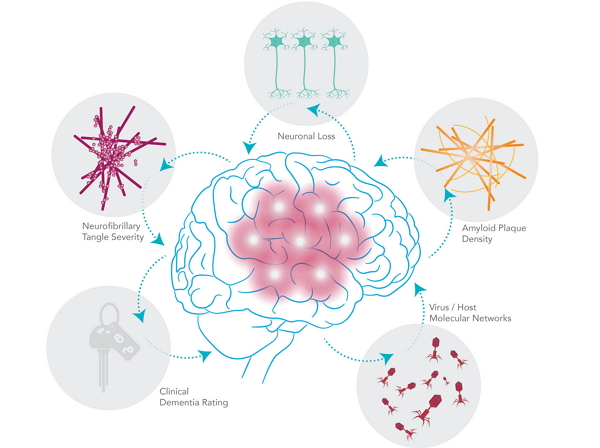 来自于亚利桑那州立大学-Banner神经退行性疾病研究中心(NDRC)的科学家们与西奈山医学院团队合作,分析了622份AD患者大脑和322份未患AD大脑的DNA、RNA测序数据和临床病理数据(包括患者生前认知衰退、去世后大脑淀粉样蛋白病斑、神经缠结等典型特征的严重程度),借助复杂的计算工具,试图解析传染病在AD领域可能发挥重要作用的机制。