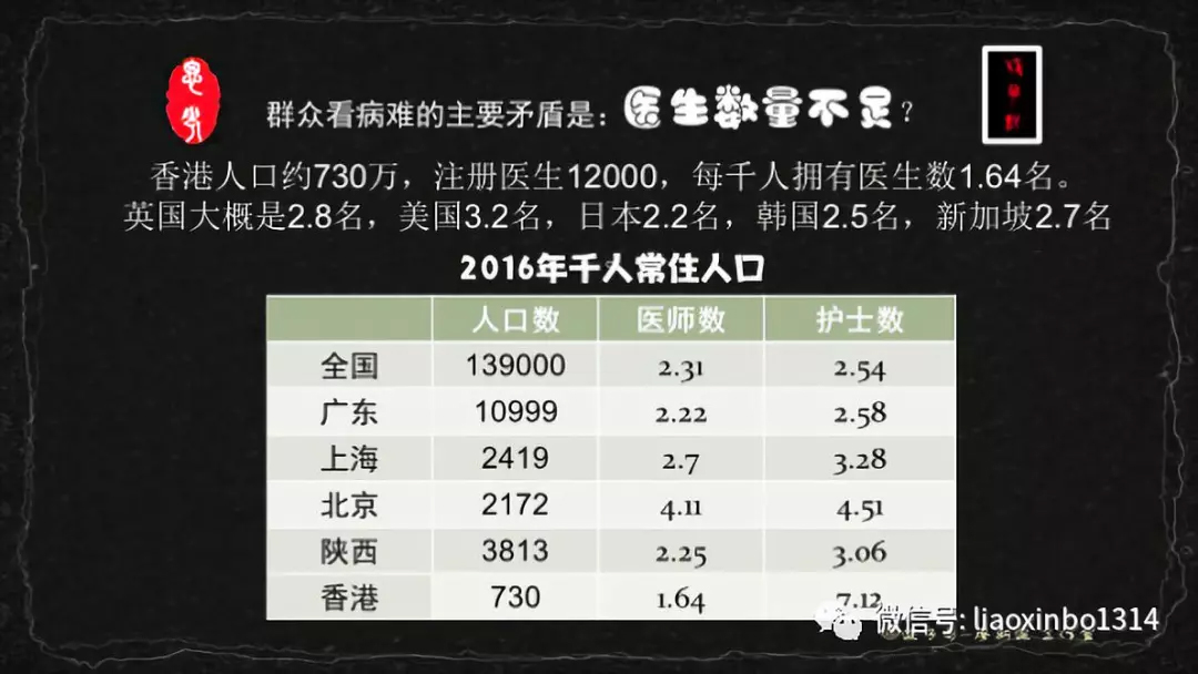 又比如:在人力资源来看,是医生的数量问题还是政策导向问题?这也是值得我们要认真研究的。我们2005年的医生数就已经达到国际平均水平,现在的千人医师数也超过不少的发达国家和地区。就拿香港来说,千人医生数仅1.64,虽然也缺医生,但是对比大陆,几乎所有省份的千人医生拥有量都超过香港,我们是否要研究是否政策的导向问题呢?为什么我们花在医疗卫生的GDP已经与香港不相上下,看病的问题却得不到较制度性的解决呢?是医生的主观能动性没有发挥出来?还是医生的价值没有得到尊重?记住:“尊重”不是说一个医生能赚多少钱,而是他如何通过他的技能得到应有的报酬。