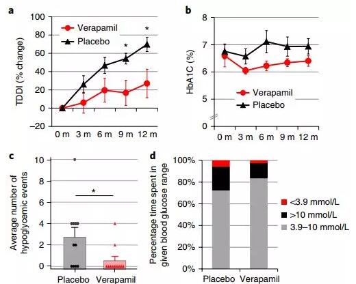 不管是胰岛功能测定、糖化血红蛋白水平、低血糖发生率还是高血糖时间段上,维拉帕米的加入都起到了明显的改善效果