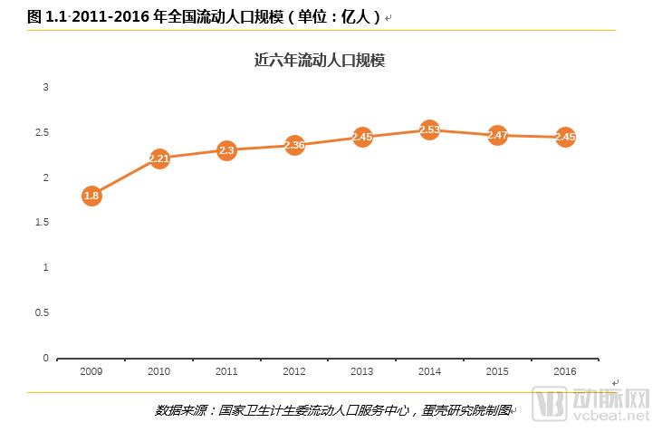 本报告根据国家卫生计生委流动人口服务中心发布的全国流动人口2011-2016年动态监测数据,通过对流动人口的流动规模、年龄、性别、婚姻状况、受教育程度、平均月收入、流动原因、流动时长、基本医疗需求等多维度多角度分析,展示近年来流动人口的生存状况。蛋壳研究院主要以2016年数据为主,分析流动人口数据和医疗需求,同时对往年数据进行回溯,观察流动人口的持续变化。