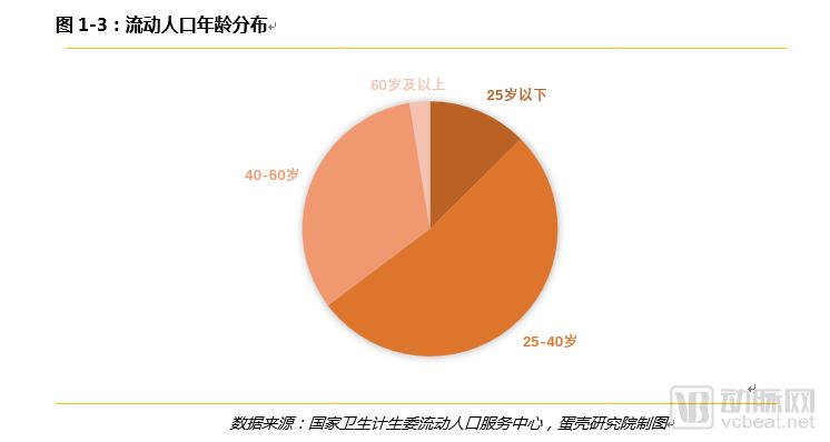 2016年的流动人口样本数据显示,男女占比分别为53.6%和46.4%,相对于全国总人口男女占比分别为51.2%和48.8%的水平来说,体现出男性人群流动倾向更大。这与我国传统男主外女主内的劳作观念有关,其次流动人口外出流动主要是参加需要较强体力的工种,因此男性更能胜任。同时流动人口中年龄层次以25-40岁之间的中青年居多,占比52.2%,反映出流动人口主要为中青年等年轻力壮的群体。