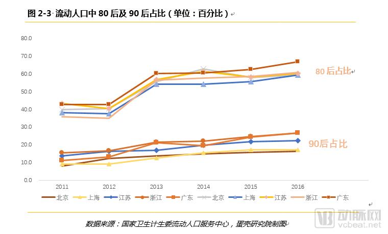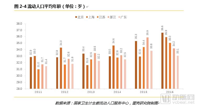 2011年-2016年六年间,流动人口中新生代人群如80后、90后占比不断提高,流动人口的年轻化趋势凸显。同时可以看到,流动人口的平均年龄却在逐步上升,以北京地区为例,从2011年的平均32.9岁增至2016年的36.5岁,其他的江浙沪粤地区皆有不同程度的平均年龄上升。这反映出流动人口除年轻化趋势明显外,中老年人占比也在缓慢增加。这主要得益于流动人口迁移过程中体现出的家庭化趋势,一般中青年在大城市就业一段时间扎稳脚跟,大部分会倾向于将老人小孩整体迁移至务工地,维持正常家庭生活。因此老人占比呈现逐步缓上升的趋势。另外,广东地区流动人口的平均年龄一直处于相对较低水平,这主要由于广东地区制造业等低端劳动密集型产业较为发达,存在大量的劳动力需求,这吸引了大量的乡村低学历青年前往务工就业,拉低了广东地区流动人口的平均年龄。